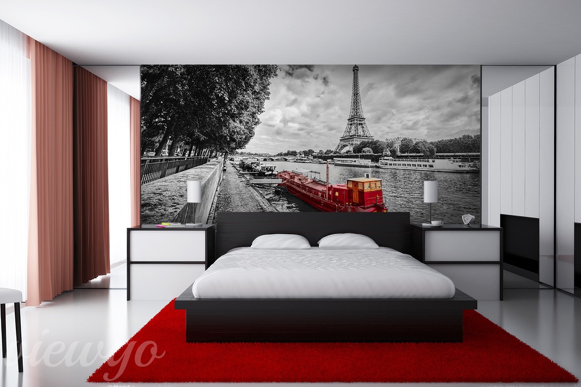 Zdjęcie wykonane w ciekawej i modnej obecnie technice. Czarno-biały widok francuskiej stolicy, a na pierwszym planie wyróżniona jedna, czerwona barka. To właśnie szczegół, który daje nam przepustkę do aranżacji wnętrza z użyciem detali w tym wyrazistym kolorze. Tapeta i przestrzeń w niej zawarta świetnie komponuje się z nowoczesną architekturą, prostym designem mebli oraz jednokolorowymi dodatkami w minimalistycznym stylu.