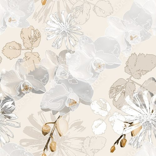Fototapeta Seamless pattern. Gray orchids and white daisies on a pale pink background.