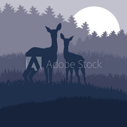 Fototapeta - Rain deer family in wild night forest foliage illustration