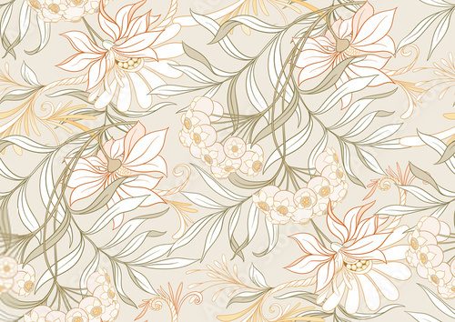 Fototapeta Seamless pattern, background with decorative flowers in art nouveau style, vintage, old, retro style. Vector illustration.