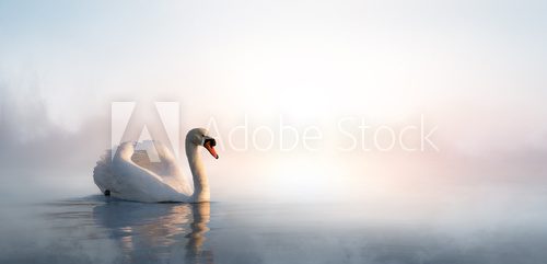 Fototapeta - Art beautiful landscape with a swan floating on the lake