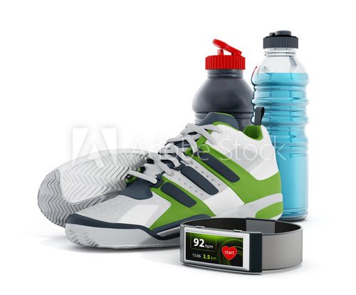Fototapeta - Jogging shoes, water bottles and smartwatch